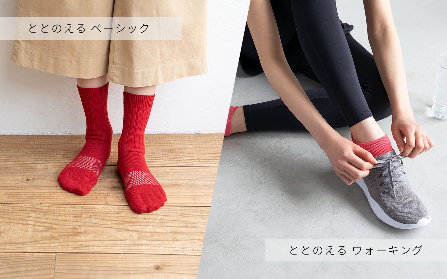 履くだけで足指が接地しやすく、重心バランスが整う〈ととのえる〉シリーズ。仕事でもカジュアルでも使える「ベーシック」と、軽い運動時やスニーカーに合わせやすい「ウォーキング」の組み合わせなら、日常のいろいろなシーンを快適な足で過ごせます。