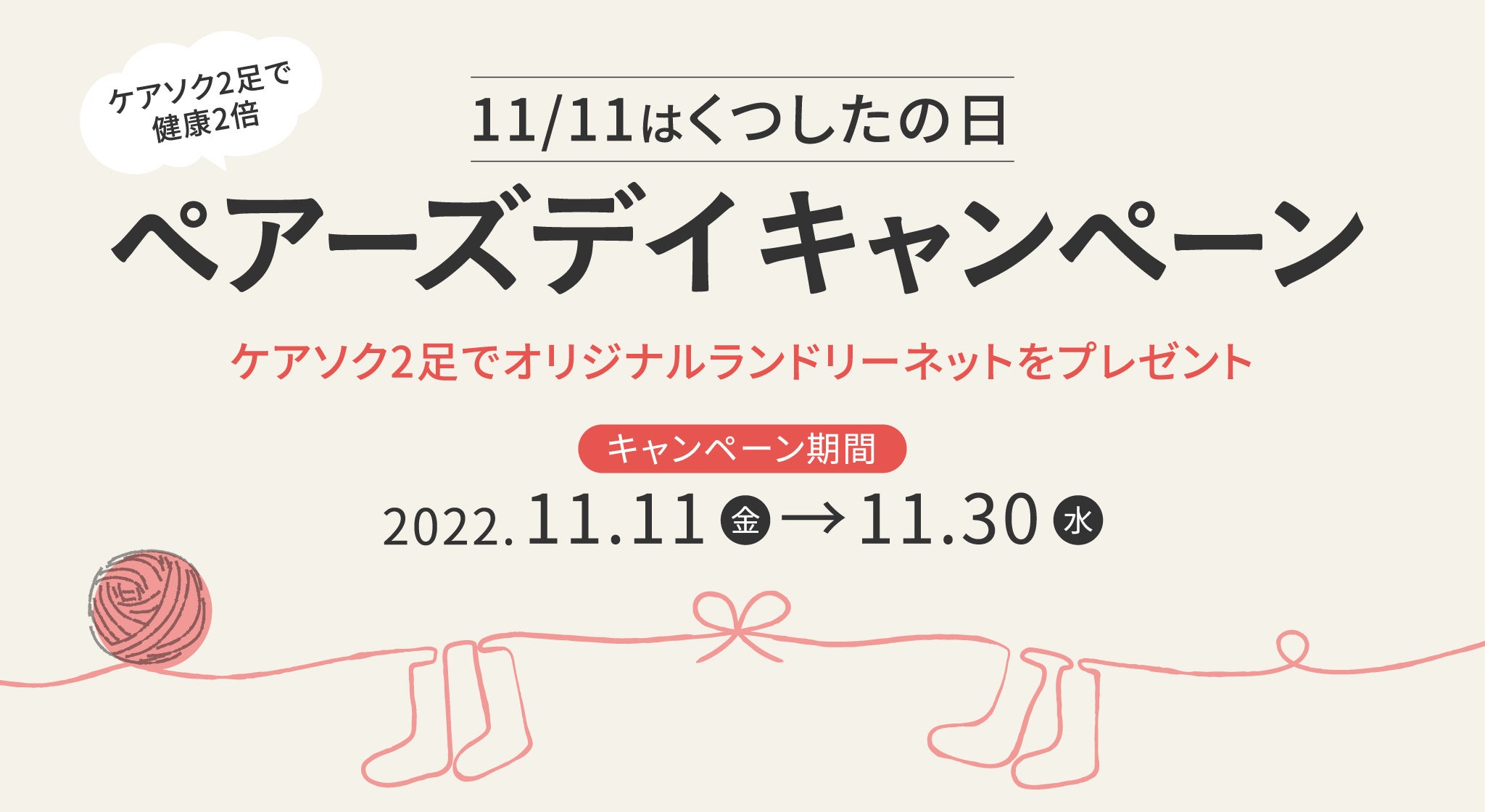 裸足よりも気持ちいい靴下”ケアソク” 11月11日「くつしたの日」に合わせて「ペアーズデイキャンペーン」を開始!購入特典としてオリジナルランドリーネットをプレゼントします。