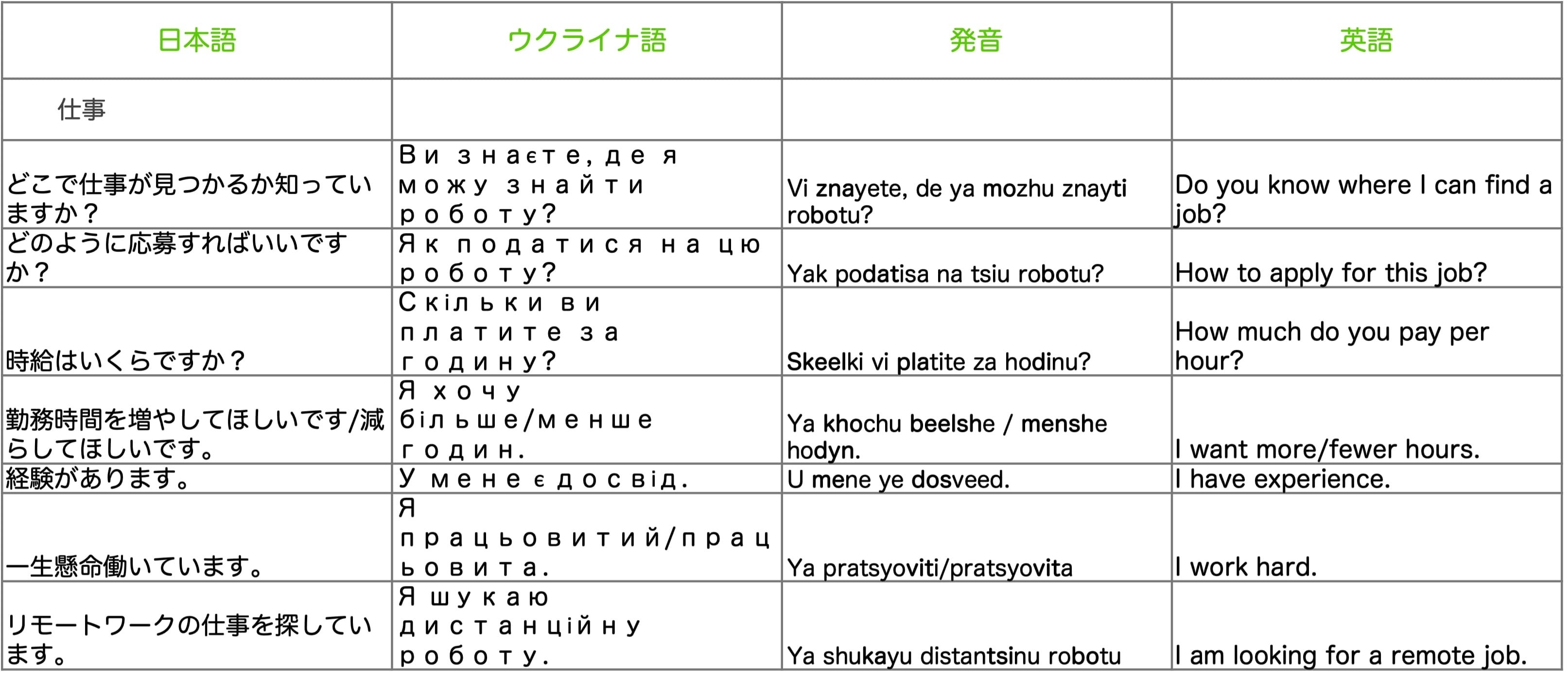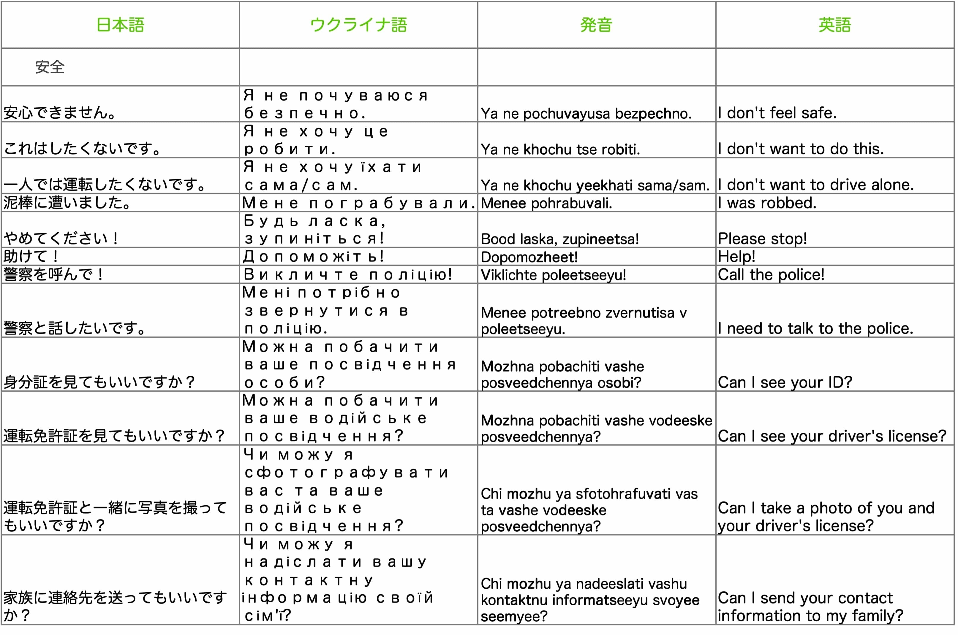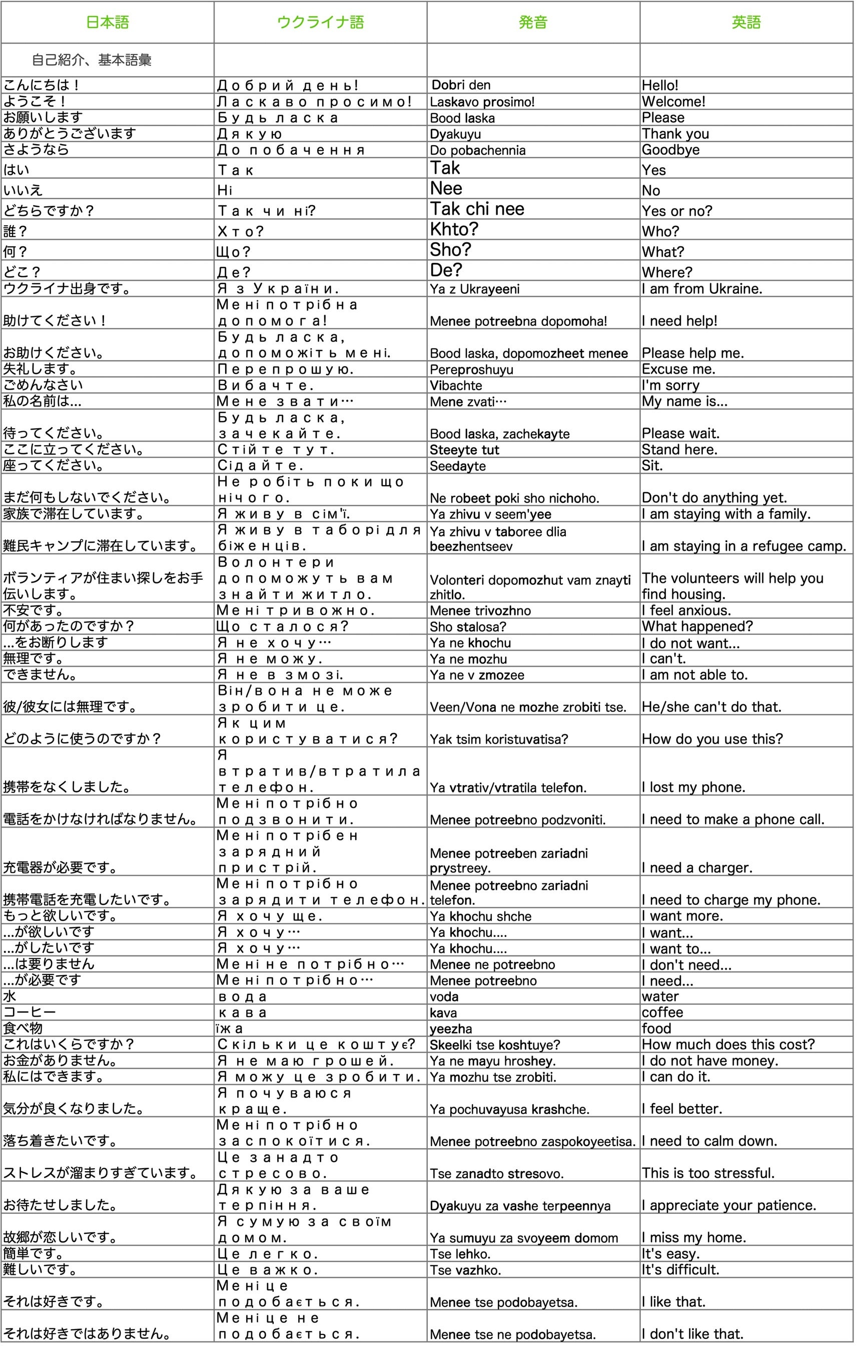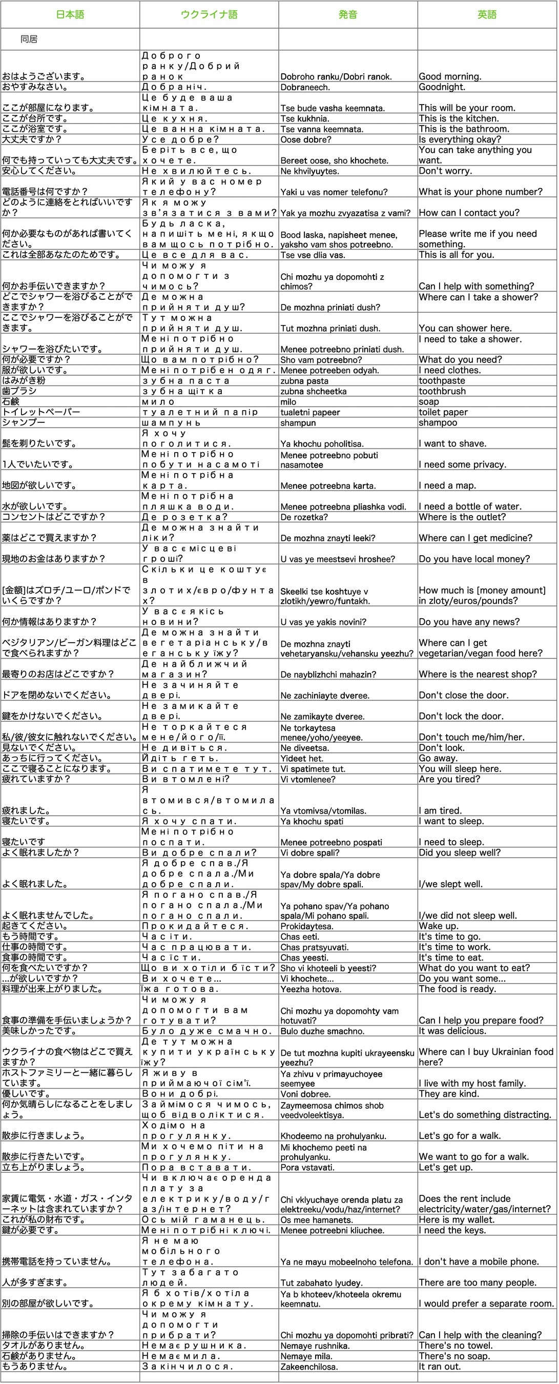 このフレーズ集は言語能力に関係なく、すべての人を対象としています。私たちは、学習者のコミュニティがこの会話集を必要とする可能性のある人のために広く共有し、ウクライナ難民やそれを受け入れる人々の助けになることを願っています。