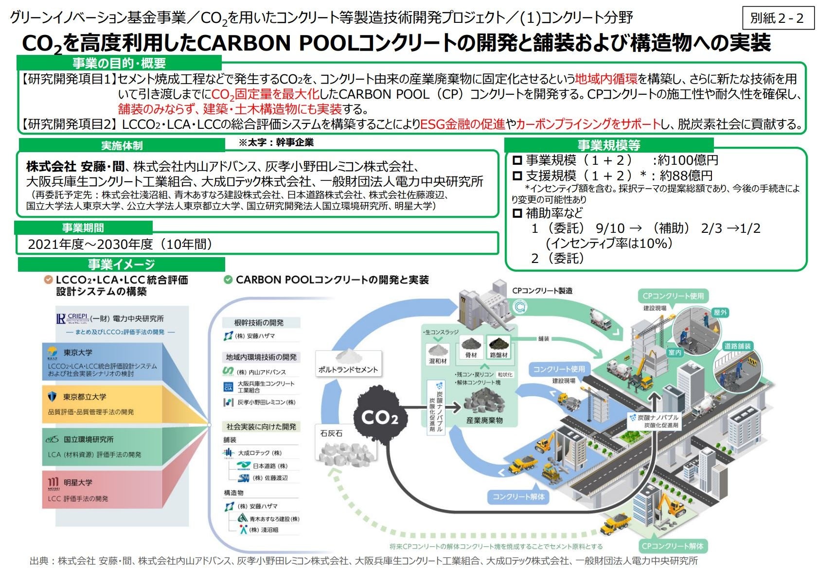 昨年10月に公募されていたNEDO・グリーンイノベーション基金事業「CO2を用いたコンクリート等製造技術開発プロジェクト」において、RRCS会員で形成したコンソーシアムが採択されたと1月28日(金) NEDOより公表された。事業期間は2030年までで、総事業費規模は約100億円、うちNEDOからの支援規模は約88億円にのぼる予定。