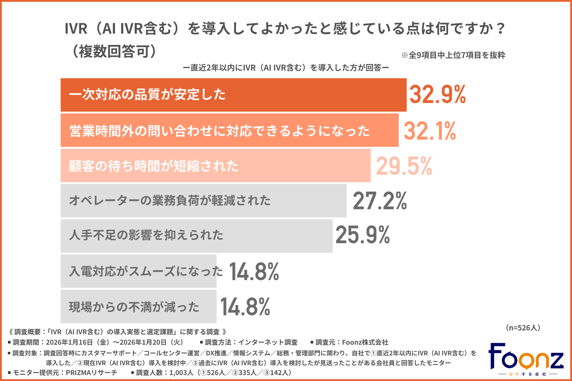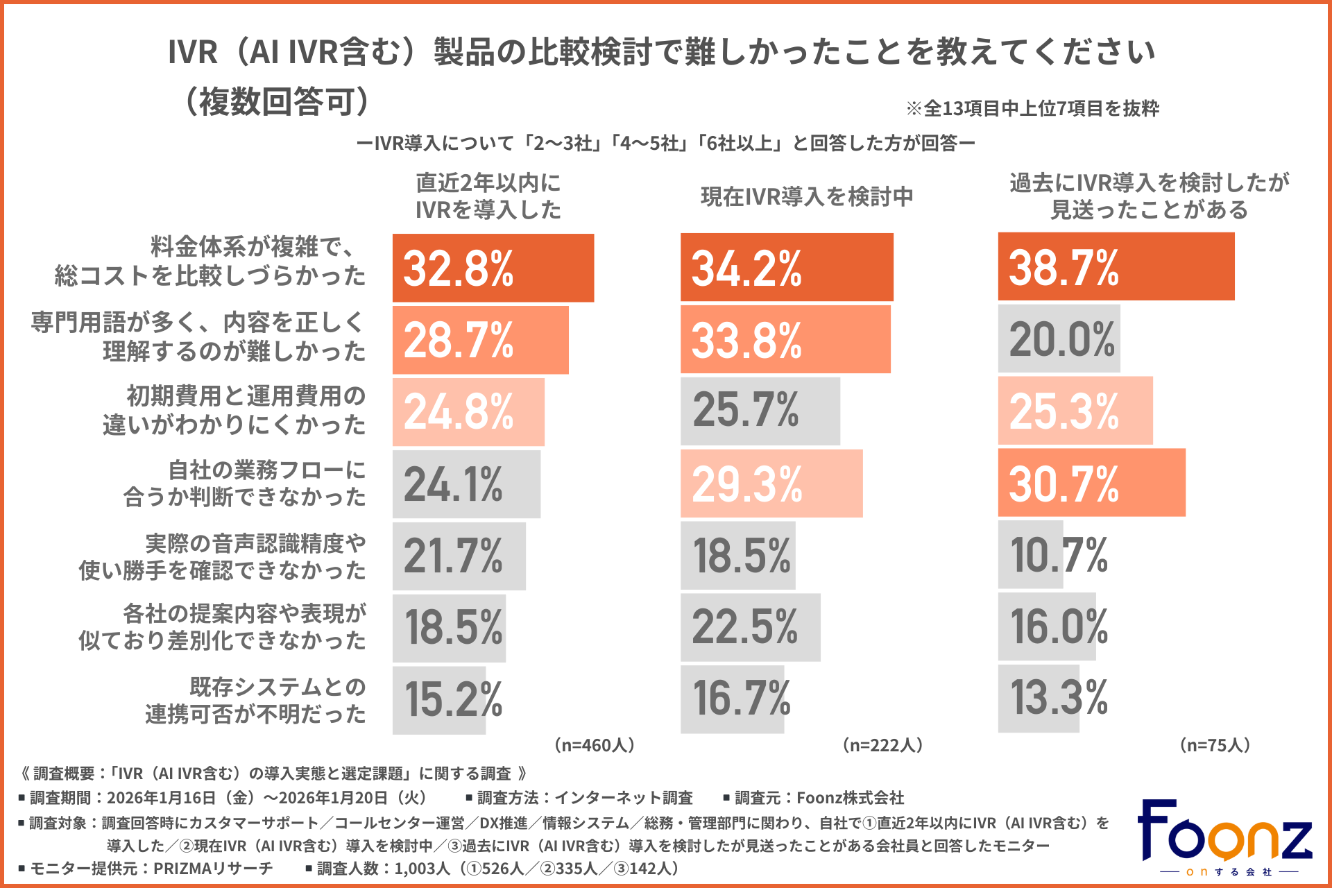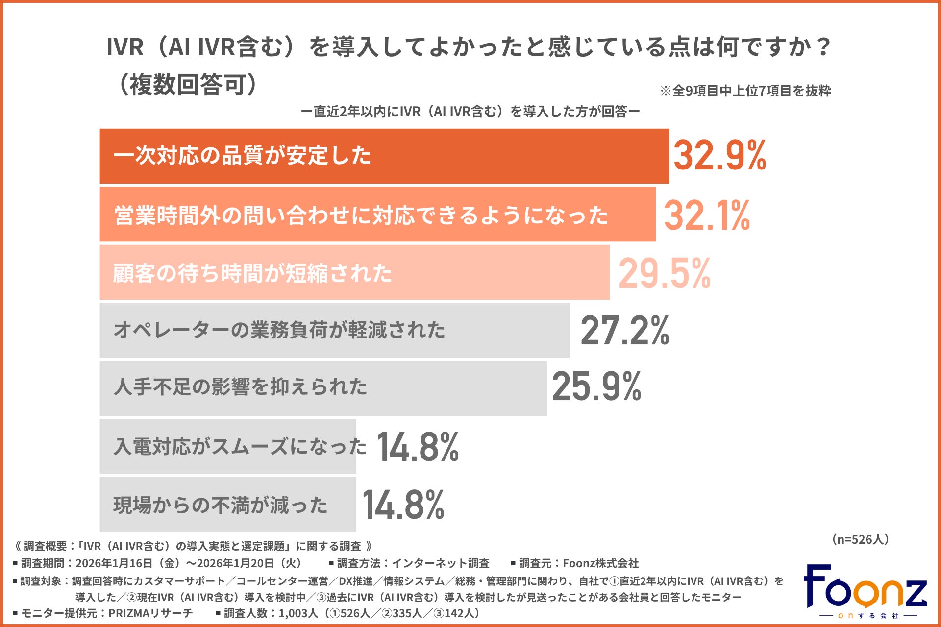 Foonz株式会社(所在地:神奈川県横浜市西区、代表取締役:星野 純一)は、カスタマーサポート/コールセンター運営/DX推進/情報システム/総務・管理部門に関わり、自社で①直近2年以内にIVR(AI IVR含む)を導入した/②現在IVR(AI IVR含む)導入を検討中/③過去にIVR(AI IVR含む)導入を検討したが見送ったことがある会社員を対象に、「IVR(AI IVR含む)の導入実態と選定課題」に関する調査を実施しました。