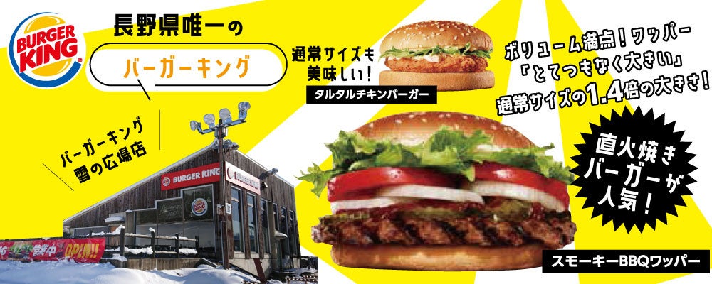 長野県唯一の「バーガーキング 雪の広場店」もオープンします。バーガーキングのハンバーガーは、通常サイズの1.4倍あり、とにかくサイズが大きく、ボリューム満点です。「ワッパー」は「とてつもなく大きなもの」という意味がある人気メニューです。また、ハンバーガーメニューだけではなく、サイドメニューやドリンクメニューも充実し、こだわりを持ったコーヒーはハンバーガーとの相性も抜群です。
