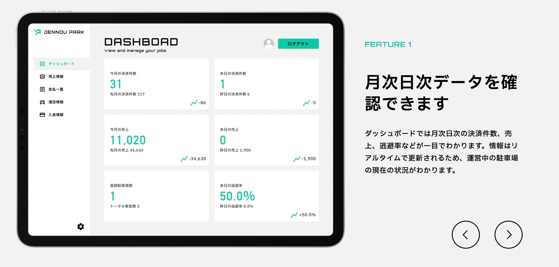 駐車場運用者様はダッシュボードで、売上等をリアルタイムで確認することができます。