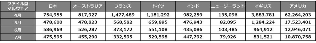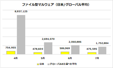 ■ファイル形式で送付されるマルウェアは、5-7月はグローバル全体で減少傾向に。
