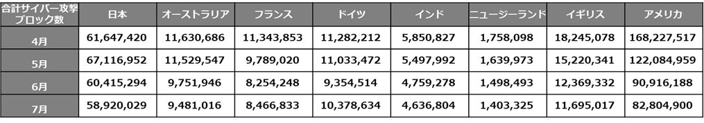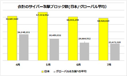 6-7月は日本だけではなく、グローバル全体でサイバー攻撃のブロック数が減少傾向にありました。下記の表は、日本のブロック数と主要8カ国*1 の平均値を並べたものです。グローバルの平均値は、4-5月は3,000万件以上でしたが、6月は約2,466万件、7月は約2,347万件と減少しました。