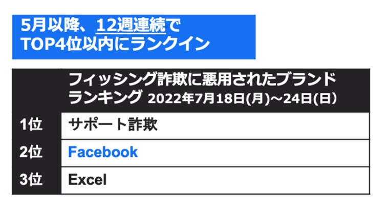 グローバル全体でもフィッシング詐欺は5-7月に増加が確認されており、その要因の一つとしては、Facebookブランドを悪用したフィッシング詐欺が横行していてことが挙げられます。ノートンでは、フィッシング詐欺に悪用されているブランド等を多い順にランキング(1週間毎)を作成していますが、ノートンラボの調べでは、Facebookが5月2日(月)から7月24日(日)までの12週間連続、上位4位以内にランクインしました。