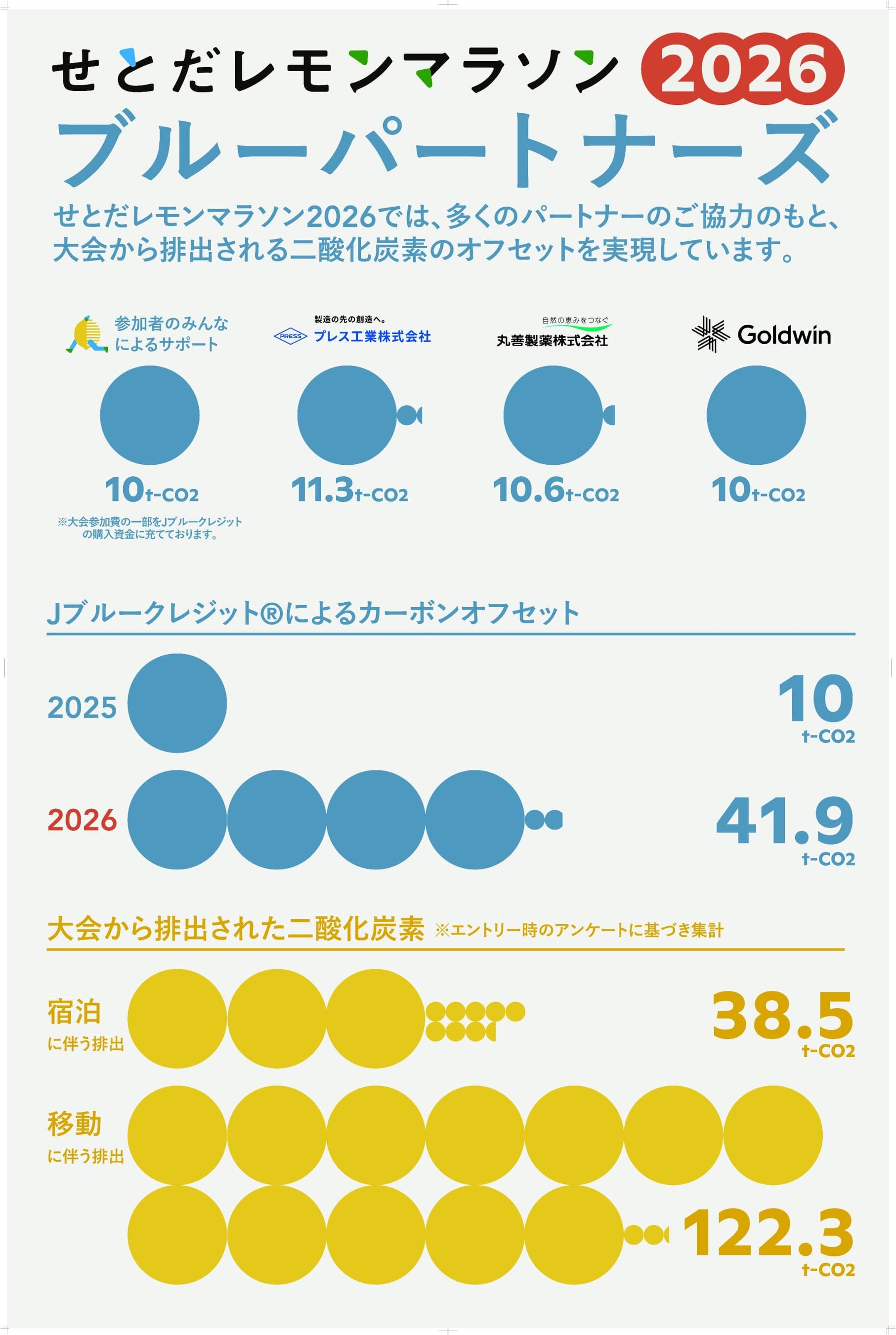 内訳は、プレス工業株式会社による11.3t-CO₂、丸善製薬株式会社による10.6t-CO₂、株式会社ゴールドウインによる10t-CO₂に加え、せとだレモンマラソン実行委員会がエントリー費の一部を活用して10t-CO₂分のクレジットを購入するものです。