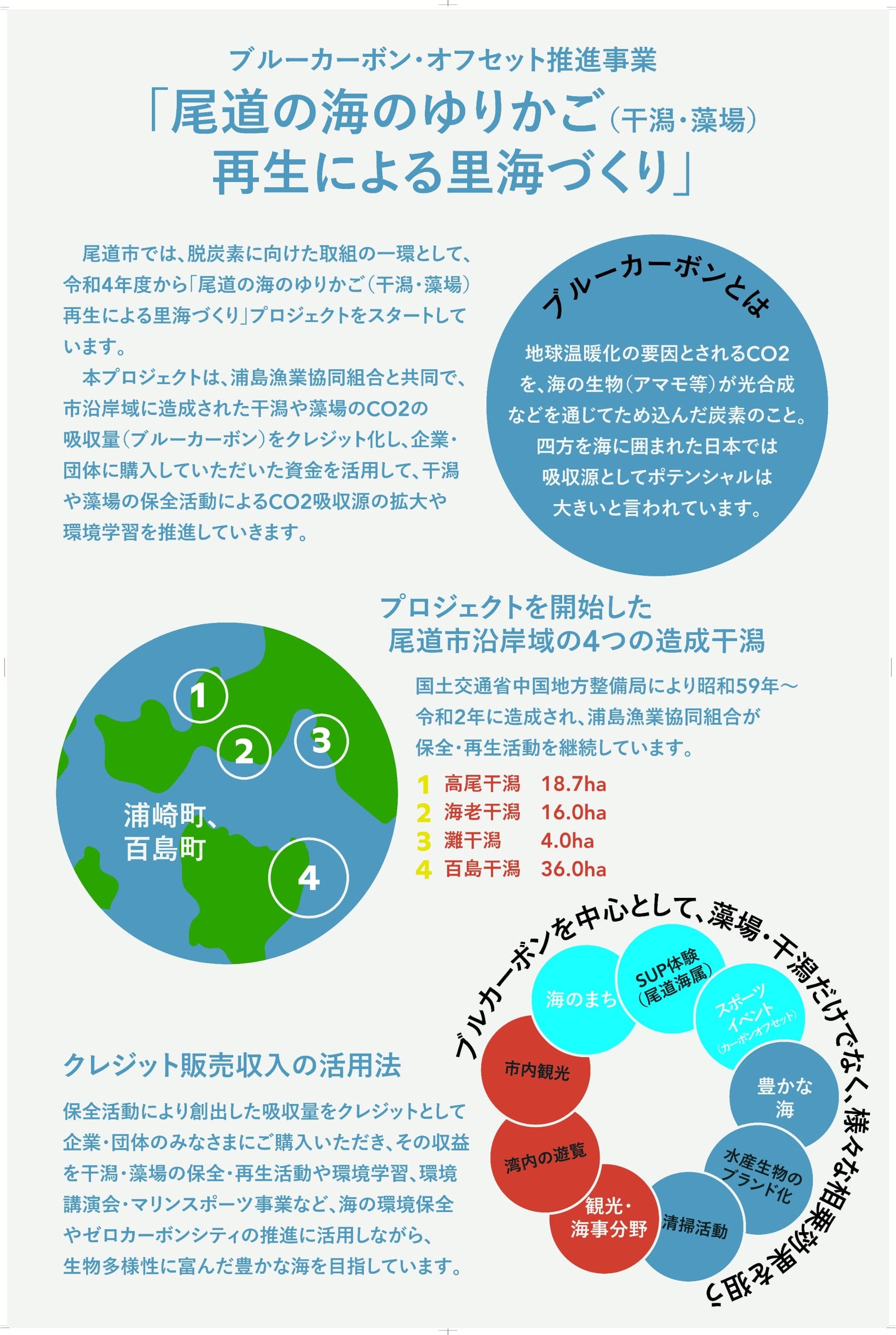 購入するカーボンクレジットは、尾道市のブルーカーボン・オフセット推進事業「尾道の海のゆりかご(干潟・藻場)再生による里海づくり」によって創出された「Jブルークレジット®」です。この事業では、クレジット販売による収益が藻場の再生に活用されるため、大会の排出量を相殺するだけでなく、海の生態系の回復にもつながります。