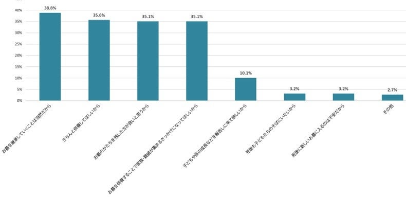 親世代に送り出す世代にお墓を継承してほしいと思う理由を聞いたところ、「お墓を継承していくことは当然だから」が38.8%で最も多く、従来の慣習を重んじる人が一定数いるなか、「きちんと供養してほしいから」が35.6%と2番目に多く、「お墓のかたちを残した方が良いと思うから」「お墓を供養することで家族・親戚が集まるきっかけになってほしいから」が同率35.1%で3番目に多い数字だったことから、自分が亡くなった後も見守ってほしいと思う人が多くいることがわかりました。