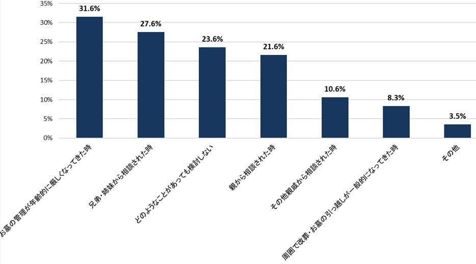 両世代の 「改葬・お墓のお引越し」を検討しない方に、どのようなことがあれば、「改葬・お墓のお引越し」を検討するかを聞いたところ、「お墓の管理が年齢的に厳しくなってきた時」が31.6%でトップ、次いで「兄弟・姉妹から相談された時」が27.6%という結果になりました。管理が厳しくなってきたという現実的な理由に加え、共にお墓を管理する兄弟・姉妹の意見が大きく影響をするという結果がわかりました。