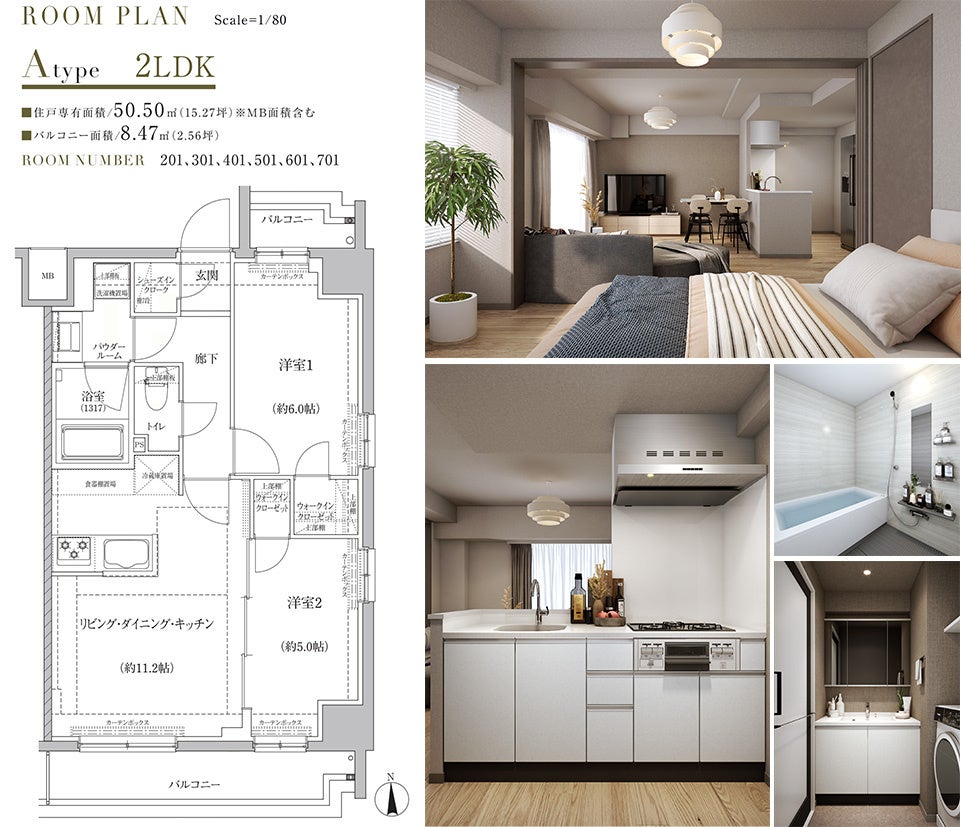 間取りは1K、2LDK(25.56㎡~51.12㎡)で構成しておりシングルおよびDINKsの方もお住まいいただけます。内装は「ホワイト」と「ナチュラル」を基調とした2種類のカラースキームです。