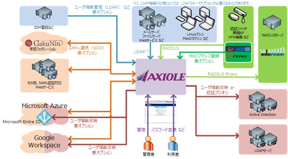 ネットスプリングのAXIOLEは、LDAP、RADIUS認証プロトコルに対応し、認証機能に特化したオールインワンの認証アプライアンスサーバ製品です。Active Directoryや他のLDAPサーバとの連携機能を標準実装するとともに、Shibboleth IdP、Google Workspace(旧Google Apps)およびMicrosoft Entra ID(旧Azure Active Directory)との外部連携機能をオプションで選択・追加が可能です。ハードウエアアプライアンス版のほかに、仮想アプライアンス版(Nutanix AHV版・VMware版)やクラウド版(Microsoft Azure版・Amazon AWS版)もラインアップされています。2006年末の製品初出荷以来、ネットワーク認証機能をコンパクトに提供する設計思想と、導入運用の容易性や安定性が支持され、大学・高専等、多数の高等教育研究機関で導入運用されてきました。近年では中堅規模以上の民間企業においても導入が進んでいます。