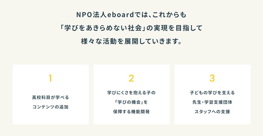 NPO法人eboardでは、これからもミッション「学びをあきらめない社会」の実現を目指し、取り組みを継続していきます。これまでのICT教材eboardの開発・運営のみならず、今後は特に下記3つの活動を展開することを目標にしています。
