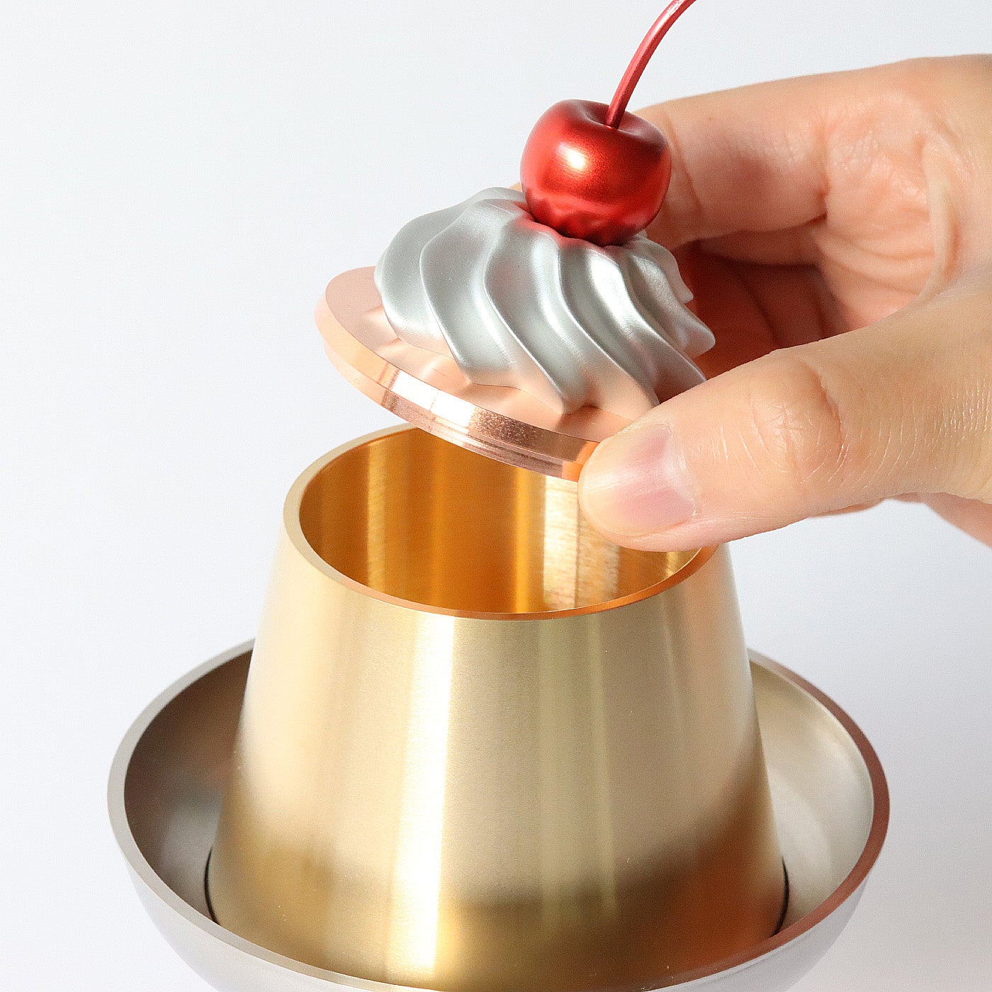 プリンのカラメル部分は重厚感のあるフタになっており、開けるとちょっとした小物入れとしても使えます。