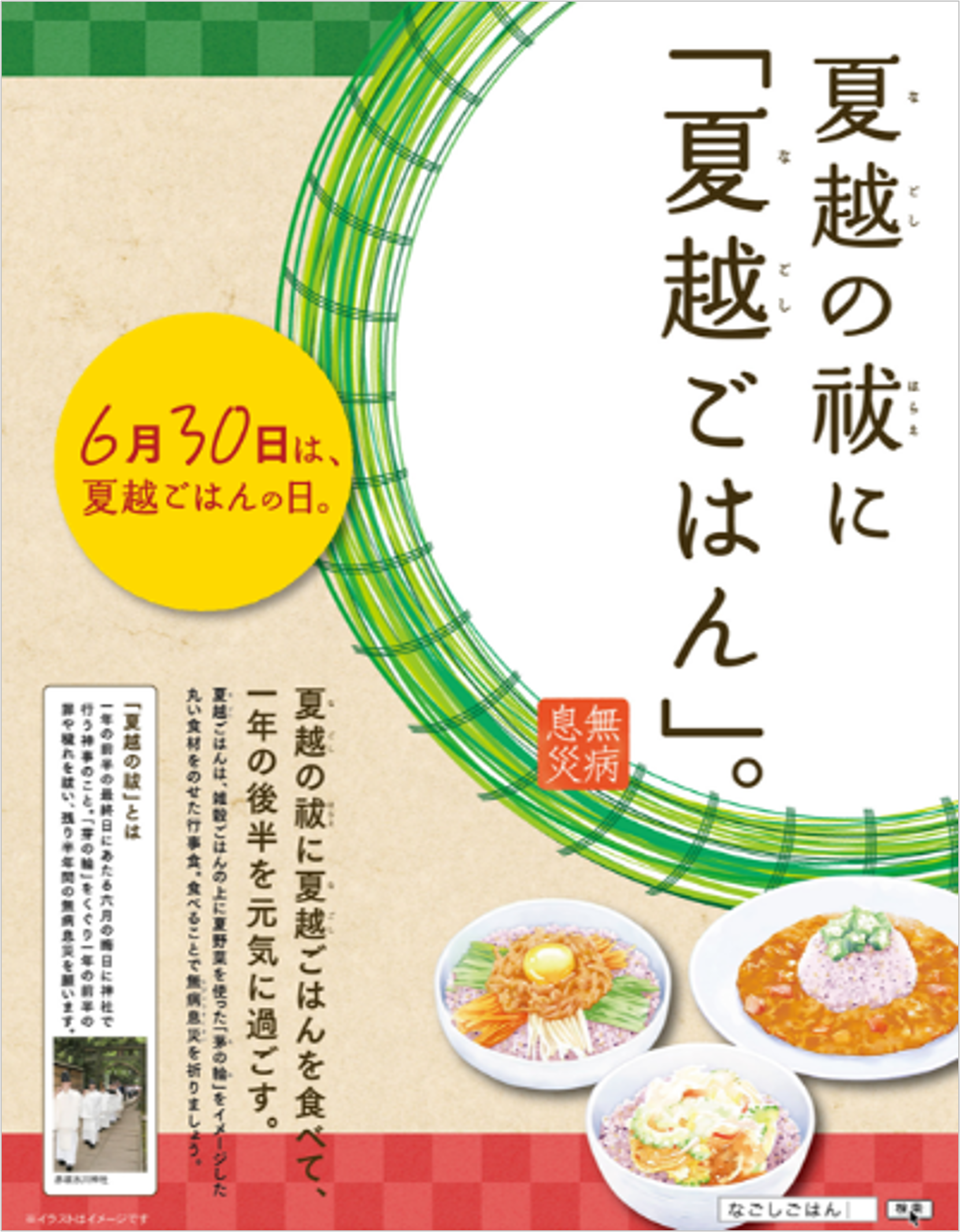 「夏越の祓」は、奈良時代より1,000 年以上続く節目の神事で、神社では鳥居の下や拝殿の前などに茅(ちがや)や藁で作った大きな輪を設け、8の字を書くように3回くぐり抜ける「茅の輪(ちのわ)くぐり」を行い、一年の前半の罪や穢れを祓い、残り半年間の無病息災を祈ります。「夏越ごはん」はこの「夏越の祓」に合わせた行事食で、蘇民将来(そみんしょうらい)が素盞嗚尊(すさのおのみこと)を「粟飯」でもてなした伝承に由来しており、雑穀ごはんの上に夏野菜を使った「茅の輪」をイメージした丸い食材を乗せたメニューレシピが主流となっています。