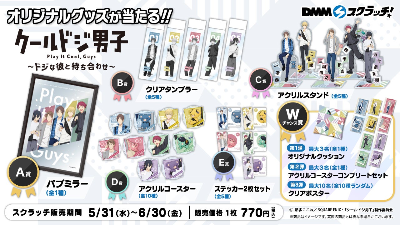 株式会社アルテミス(本社:東京都港区、代表取締役:泉浩樹)は、ハズレなしのオンラインくじサービス「ハピネスチャンスクジ」(通称:ハピチャンクジ)、「DMMスクラッチ」(併売)にて、2023年5月31日(水)からTVアニメ 『クールドジ男子』~ドジな彼と待ち合わせ~くじを1回770円(税込み)で販売開始いたします。