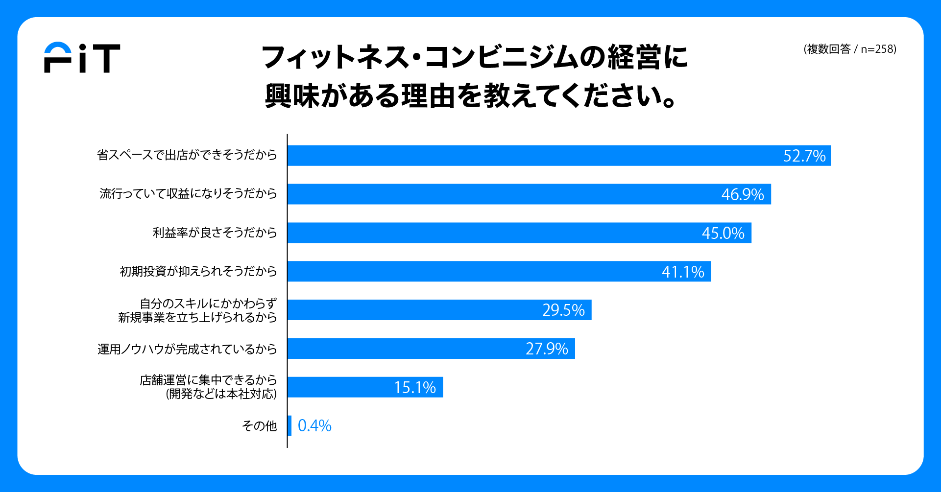フィットネス・コンビニジムの経営に興味がある理由を尋ねたところ、「省スペースで出店ができそうだから」が52.7%と最も多く、「流行っていて収益になりそうだから」が46.9%、「利益率が良さそうだから」が45.0%と続きました(n=258/フィットネス・コンビニジムの経営に興味がある人)。