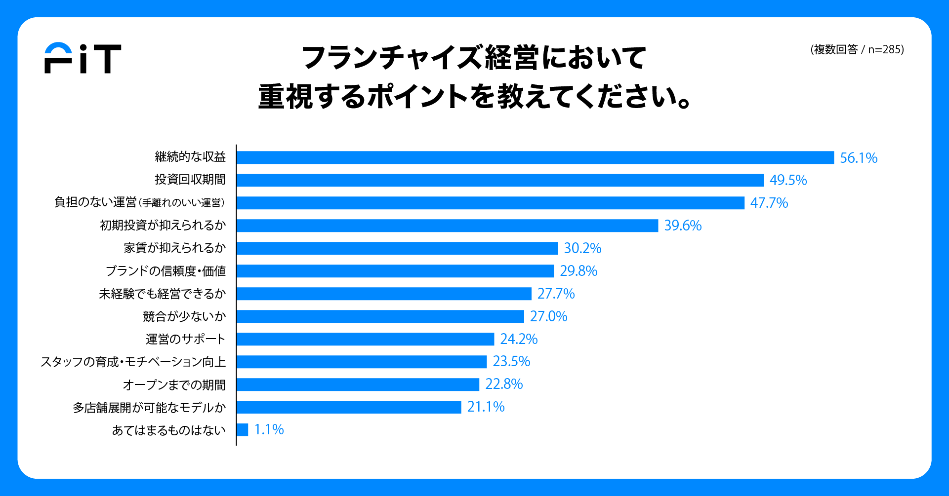 フランチャイズ経営経験者に、フランチャイズ経営において重視するポイントを尋ねたところ、「継続的な収益」が56.1%で最も多く、「投資回収期間」が49.5%、「負担のない運営(手離れのいい運営)」が47.7%と続きました(n=285/フランチャイズ経営経験がある人)。