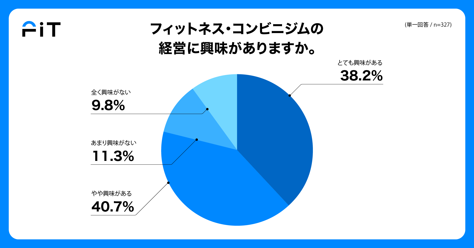 フィットネス・コンビニジムの経営に興味があるか尋ねたところ、「とても興味がある」と「やや興味がある」が合わせて78.9%で、約8割が興味があることがわかりました(n=327)。