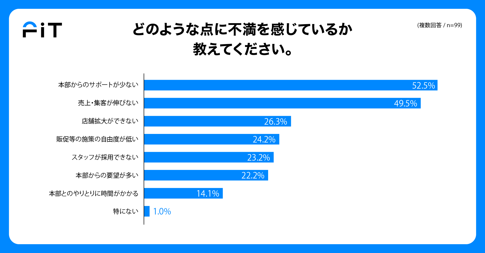 約半数が本部からのサポート力や、売上・集客の伸び悩みに不満