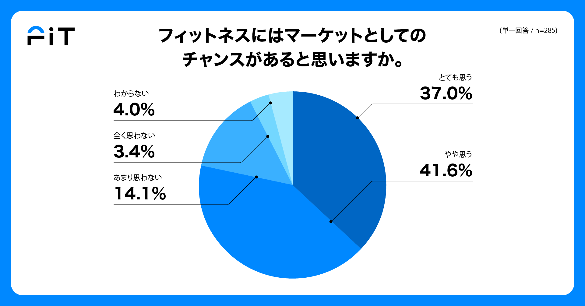 フィットネスにはマーケットとしてのチャンスがあると思うか尋ねたところ、「とても思う」と「やや思う」が合わせて78.6%と、約8割がマーケットチャンスを感じていることがわかりました(n=327)。