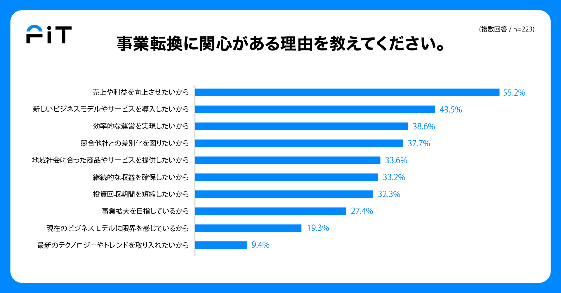 事業転換に関心がある理由を尋ねたところ、「売上や利益を向上させたいから」が55.2%で最も多く、「新しいビジネスモデルやサービスを導入したいから」が43.5%、「効率的な運営を実現したいから」が38.6%と続きました(n=223/事業転換への関心がある人)。
