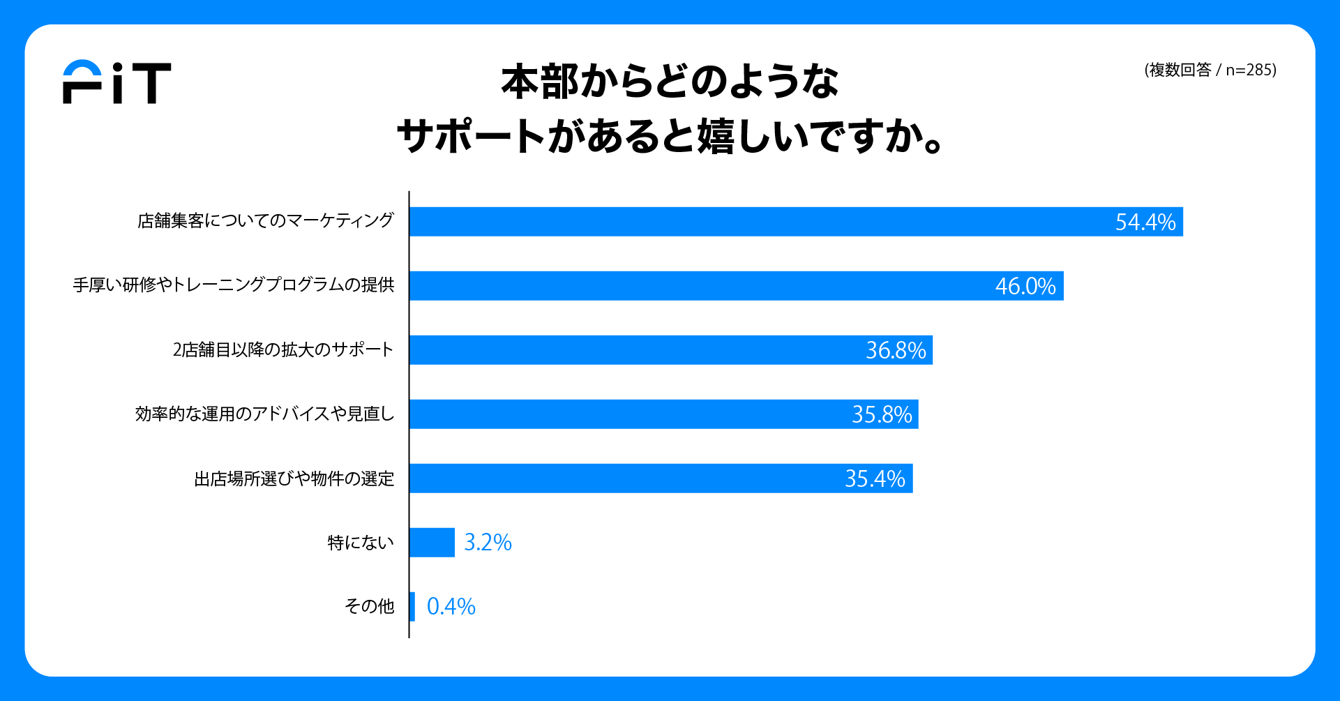 本部からサポートしてほしいこと、1位「店舗集客についてのマーケティング」2位「手厚い研修やトレーニングプログラムの提供」3位「店舗拡大のサポート」