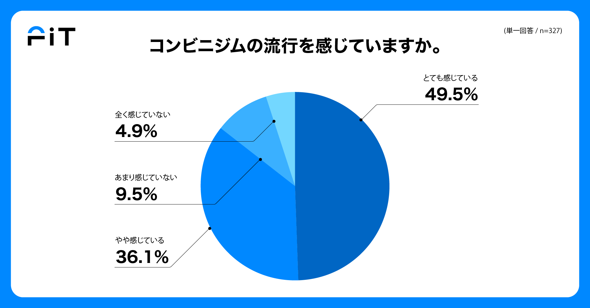 コンビニジムの流行を感じているか尋ねたところ、「とても感じている」と「やや感じている」が合わせて85.6%で、約9割が流行を感じていることがわかりました(n=327)。