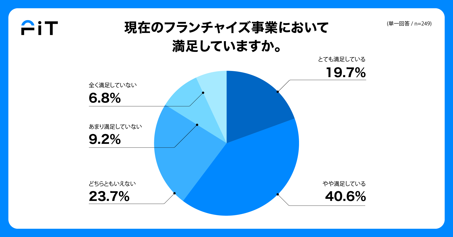 現在のフランチャイズ事業において満足しているか尋ねたところ、「とても満足している」と「やや満足している」を合わせて60.3%と、約6割が満足していることがわかりました(n=249/現在フランチャイズ経営を行っている人)。