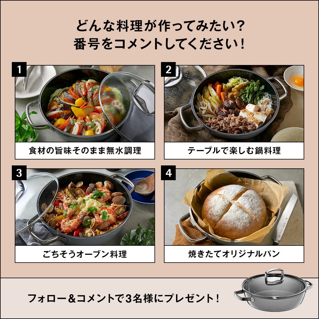 WMF公式インスタグラムアカウント(@wmf_japan)をフォローし、アカウント上のキャンペーン投稿に「フュージョンテック ミネラル ロースター24cm PL」で作ってみたい料理を選んで応募ください。
