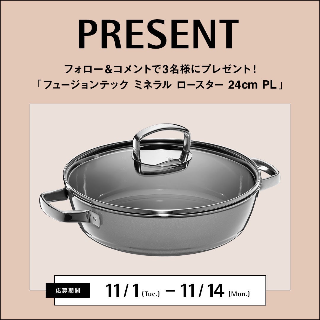 株式会社グループセブ ジャパン(本社:東京都港区/代表取締役社長:アンドリュー・ブバラ)は、2022年11月1日(火)より、ドイツのNo.1キッチン&テーブルウェアブランド「WMF(ヴェーエムエフ)」の公式インスタグラムアカウントにおいて、「フュージョンテック ミネラル ロースター24cm PL」を3名様にプレゼントするキャンペーンを実施いたします。WMFの公式インスタグラムアカウント(@wmf_japan)をフォローし、キャンペーン投稿にコメントをしてご応募ください。