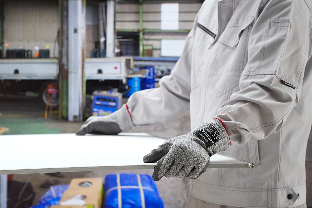 新しい耐切創手袋シリーズ「WIRETEX(ワイヤーテックス)」は、耐切創レベルE (※1)という高い耐切創強度がありながらもゴワつきが少なく、手になじむやわらかさで優れた作業性を発揮します。繊維部分には、ステンレスワイヤー糸と高強度ポリエチレン糸を組み合わせた複合糸を使い、耐切創強度を高めています。ガラスや建材の運搬・加工、鋼板製造などの現場でご使用いただけます。