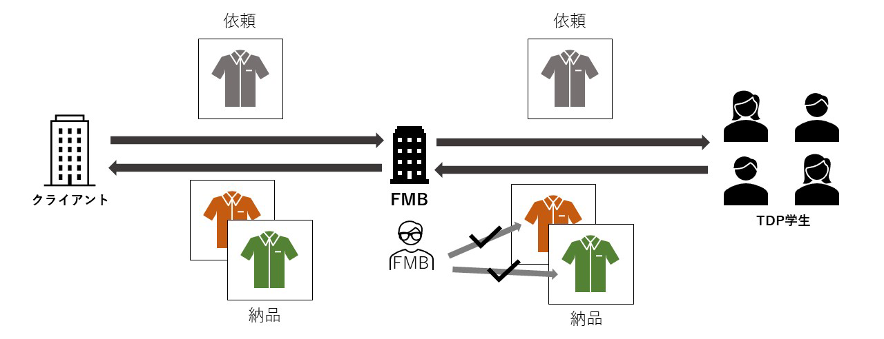 FMBは、高度なPhotoshop技術を要する業務をTDPの画像加工に関する科目のあるクラスの学生に業務依頼として外注します。作業者が直接クライアントに納品するのではなく、専門知識・技術を持ったFMBのスタッフが監修した後に納品を行うので、TDP側では実務レベルの納品物に見合うスキルを身に着けることができ、クライアント側は品質の保証された納品物を受け取ることができます。