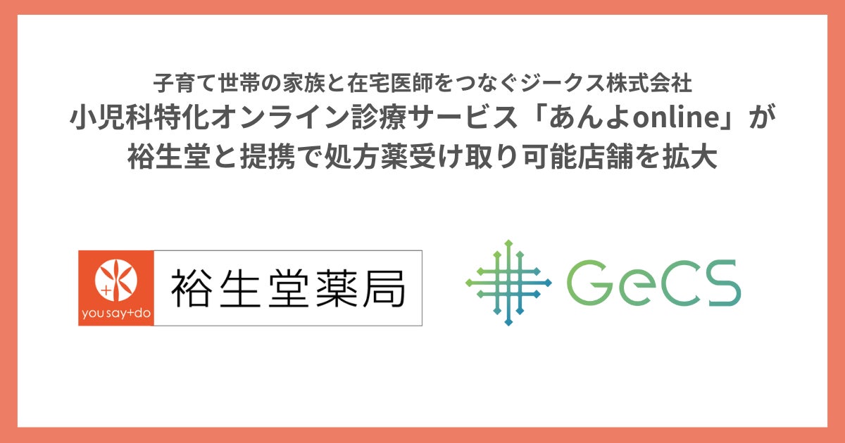 小児科にかかりたい子育て世帯と在宅で働く医師をつなぐオンライン診療サービス「あんよonline」を運営するジークス株式会社(愛知県名古屋市、代表取締役社長CEO:村上嘉一、以下「当社」)は、株式会社裕生堂(福岡県福岡市、取締役社長:塚田真二朗)と提携し、福岡県における処方薬受け取り可能店舗を全国に拡大いたします。