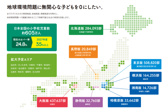 現在、北海道・東京・神奈川・長野・静岡・大阪の約3,750校の小学校を通じて150万人の児童に、毎月、無料配布されており、環境教育教材や親子の対話ツールとして親しまれている親子向けの環境・SDGs教育メディアです。