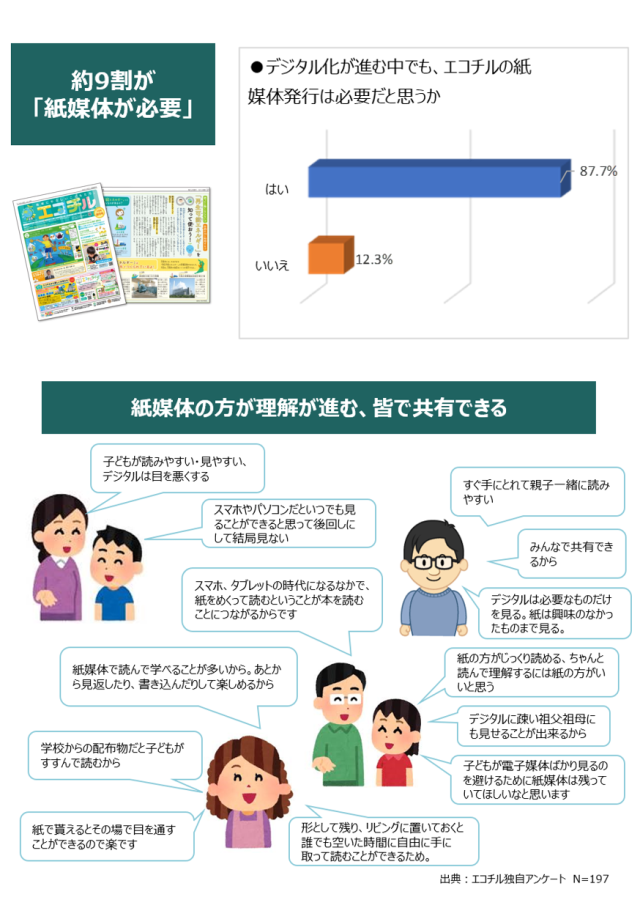 2024年4月に「デジタル化が進む中でも、エコチルの紙媒体発行は必要ですか?」という読者アンケート調査を行った結果、87.7%の親子が「紙媒体が必要」と回答しました。PCやスマホなどデジタルツールが一般化するなかで、紙媒体は子どもの深い理解につながり、親子のコミュニケーションを活性化できるとの声が多数。紙媒体に触れることで読書機会増加に対する期待も大きく、子どもの活字慣れや読書促進、環境教育の理解促進につながっています。