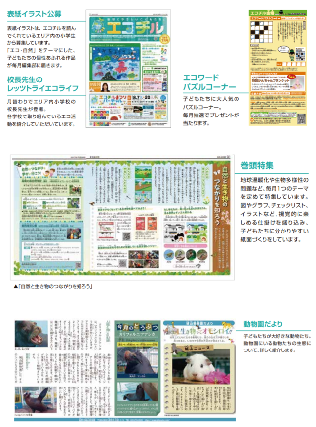 毎月、地球温暖化や生物多様性、省エネ・再エネなど、1つのテーマを定めた巻頭特集をはじめ、動物園だより、プレゼントが当たる大人気のエコワードパズルなど、図やイラストをふんだんに使った、子どもたちが親しみやすい紙面が特徴です。また、巻頭特集や動物園コーナーは、各自治体と連携協定を締結して地域に根差したオリジナルの環境情報を協働で編集しています。