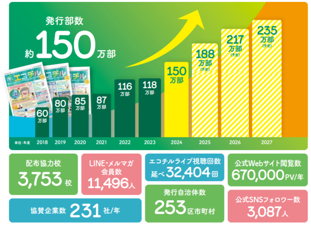 「エコチルオフィシャルパートナープログラム」は、現在、北海道・東京・神奈川・長野・静岡・大阪の約3,750校の小学校を中心に150万人の子どもたちとその保護者に無料配布している「エコチル」を、2027年度までに全国全ての政令指定都市に拡大するとともに、235万人の子どもたちに毎月の無料配布を目指しています。