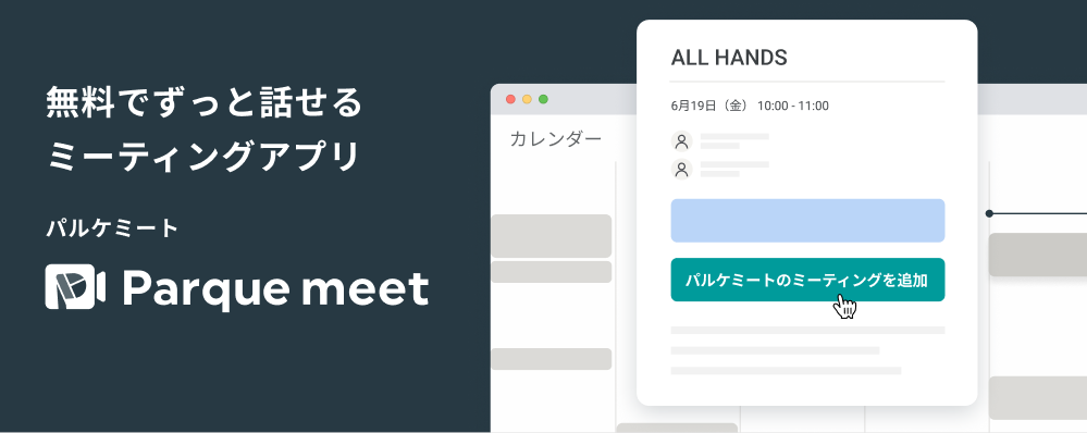 働く人が気軽に集まるコミュニケーションアプリを提供する株式会社パルケ(本社:東京都港区、代表取締役:鎌田大輔)は、無料でずっと話せるミーティングアプリ「パルケミート」のサービス連携・第1弾として、Googleカレンダー連携のChrome拡張機能「パルケミート for Google Chrome」の提供を開始いたしました。これにより、Googleカレンダーから直接ミーティングの予定を作成できるなど、さらにスムーズにウェブ会議を開催・招待することができます。