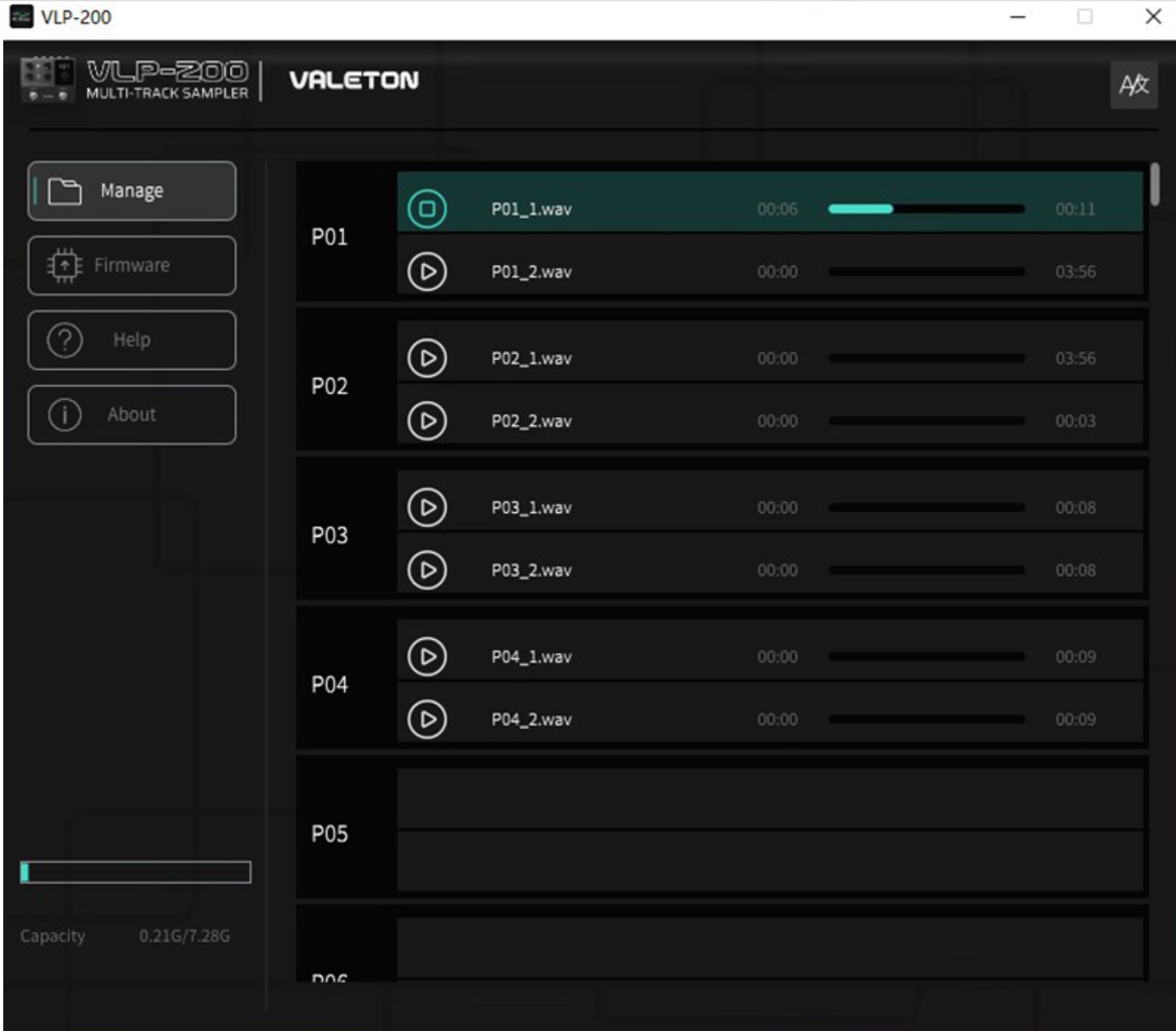 VLP-200 は、24 ビット、48 kHz の高サンプリング レート デジタル オーディオ処理を使用して、プロ品質の録音を実現します。最大 99 個のプロジェクト ストレージ スペースがあり、各スペースには、最大 4 分のステレオ録音ファイル (24 ビット、48 kHz、WAV) の 1 つのループが合計 7 時間保存できます。各プロジェクトに保存される情報には、ループ 1 とループ 2 のすべての録音、選択したドラム リズム パターン、およびドラム マシンの BPM が含まれます。パフォーマンスには、ポータブル ミュージック ライブラリを持参して、VLP-200 をバンド仲間にしましょう。