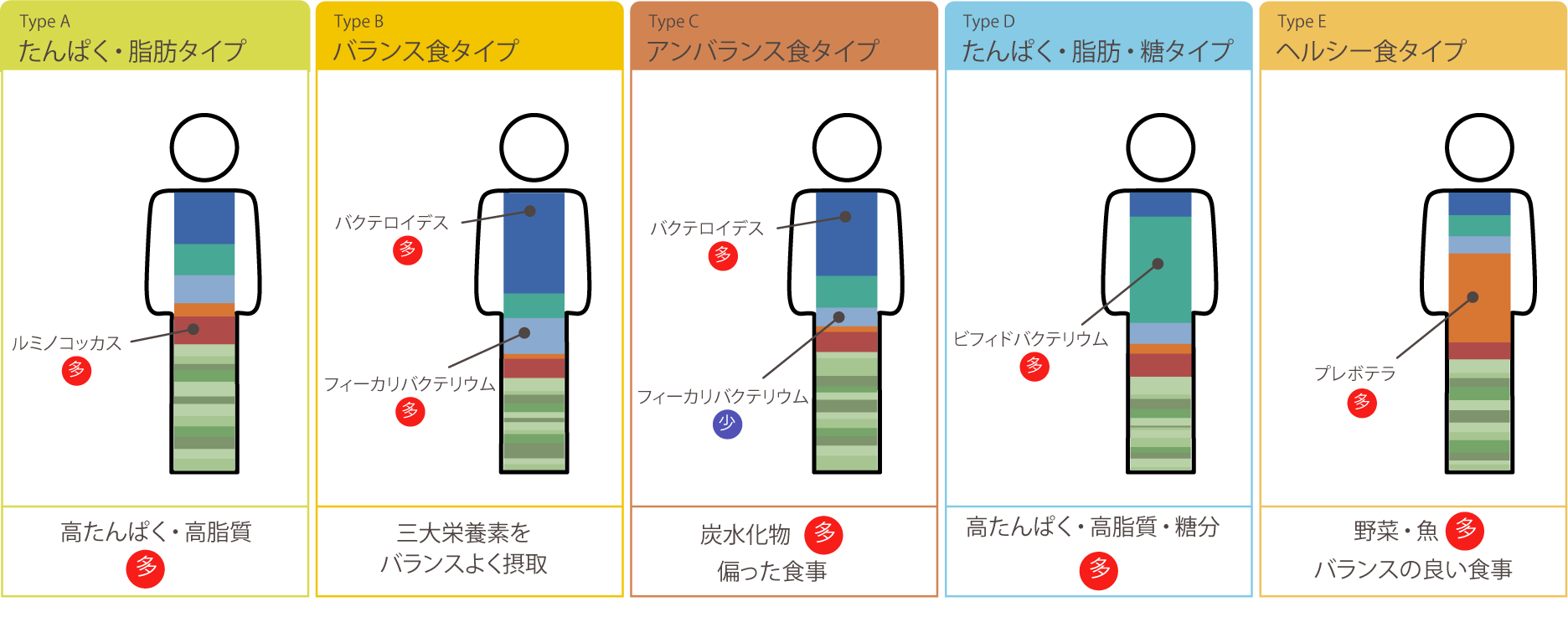 そこで腸内細菌叢のタイプ分類を行うことで、各タイプにおける疾患との関連度評価など、網羅的に腸内細菌叢を評価することが可能となりました。