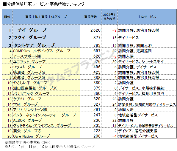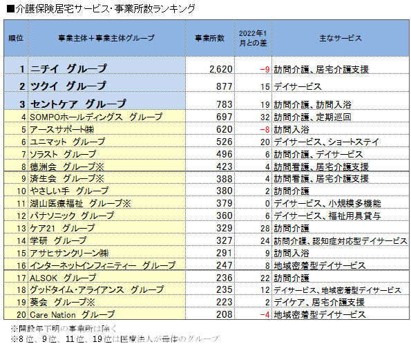 トップは「ニチイ グループ」の2,620ヶ所となり、事業所数は前回からほぼ横ばいながら、2位「ツクイ グループ」の約3倍と突出した事業所数となっている。以下、「ツクイ グループ」877ヶ所、「セントケア グループ」783ヶ所と続く。