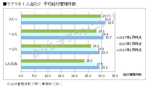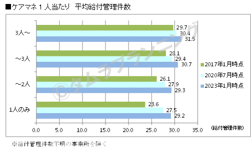 同サービスでは、2018年度のケアマネ受験資格変更の影響により、受験者数が2017年度の13.2万人から2021年度には5.4万人へと大きく減少している。また、採算性の問題や後継者不足に加え、近年、ICTを導入した事業所では、ケアマネ1人当たりのケアプラン担当件数の上限が引き上げられる等、効率化を誘導する動きも見られ(次項グラフ参考)、これら様々な要素が事業所数減少の要因として考えられる。