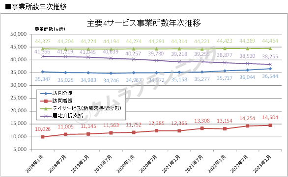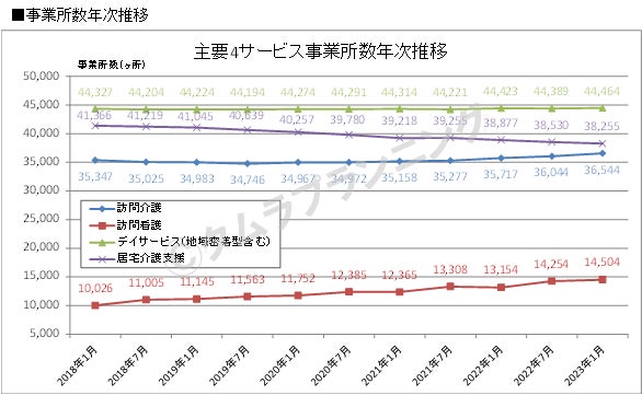近年、在宅における医療ニーズの高まりを受け、「訪問看護」の増加が著しく、増加傾向が続いている。特に、営利法人による事業参入が目立ち、ホスピス系(株式会社アンビス等)や精神疾患系(株式会社ファーストナース等)に特化したオペレーター等も見られ、2022年7月から2023年1月にかけては250ヶ所増となっている。また、「訪問介護」は2020年のコロナ禍以降、増加傾向が顕著となっており、2022年7月から2023年1月にかけて500ヶ所増となり、主要4サービスの中では最多増加数となっている。