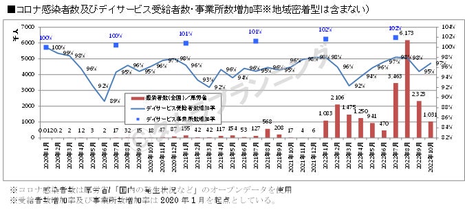「デイサービス」(※地域密着型を含む)は2023年1月時点で44,464ヶ所となり、ほぼ横ばいで推移している。デイサービスは近年のコロナ禍によって大きな影響を受けており、コロナ感染者数の増加に伴い、受給者数が左右される状況が続いている(次項グラフ参考)。