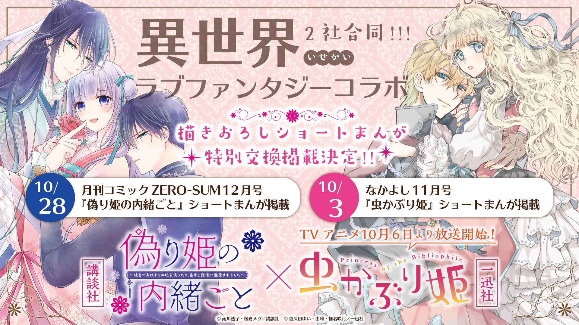 株式会社一迅社(所在地:東京都新宿区 代表取締役社長 野内雅宏)は、由唯が原作、喜久田 ゆいがコミカライズを担当している『虫かぶり姫』と雨川透子が原作、桜倉メグが漫画を担当している『偽り姫の内緒ごと ~後宮で身代わりの妃を演じたら、皇帝と護衛に寵愛されました~』(講談社)の最新刊発売を記念して2作品で2社合同『異世界ラブファンタジーコラボ』を実施いたします。
