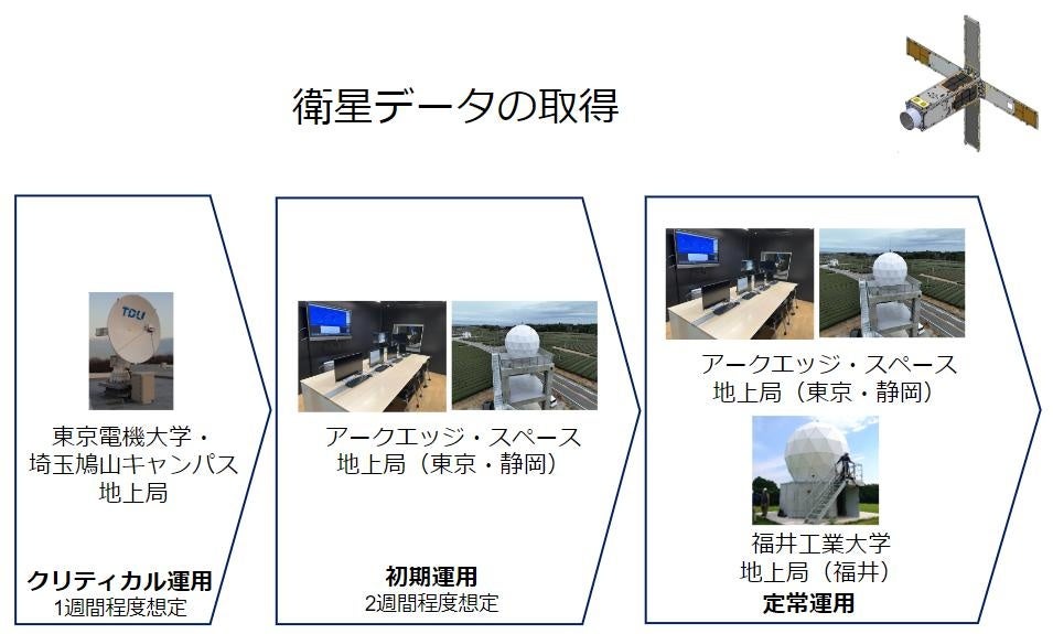 TIRSAT は、当社と、セーレン、福井大学、福井工業大学とで協力し同衛星の運用を行う予定です。受信局としては、当社の牧之原地上局のほか、東京電機大学及び福井工業大学の計3か所のアンテナ局を、通信所としては、アークエッジ・スペース通信所(当社有明本社内)及びセーレンの TPF 事業所(福井県坂井市)内に設置するセーレン通信所の2か所を利用して、軌道への投入後から人工衛星と受信局との通信確保(クリティカル運用)と、人工衛星の健全性の確認(初期運用)を約2週間かけて行います。問題がなければ定常運用に移行し、非冷却小型熱赤外センサ等の実証実験を開始する予定です。