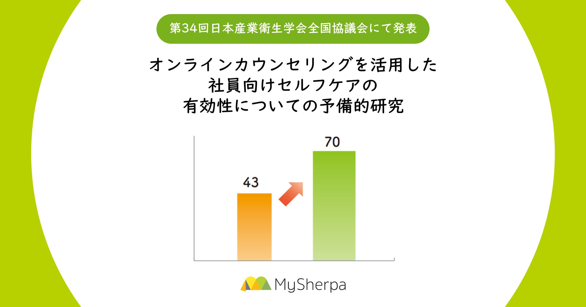メンタルヘルスケア支援サービスを提供する株式会社マイシェルパ(以下、当社)の代表取締役 松本良平は、2024年10月3日(木)から5日(土)にかずさアカデミアパークで開催された「第34回日本産業衛生学会全国協議会」において、「オンラインカウンセリングを活用した社員向けセルフケアの有効性についての予備的研究」を発表しました。本研究は、オンラインカウンセリングが従業員のメンタルヘルスセルフケアに及ぼす効果を検証したものです。