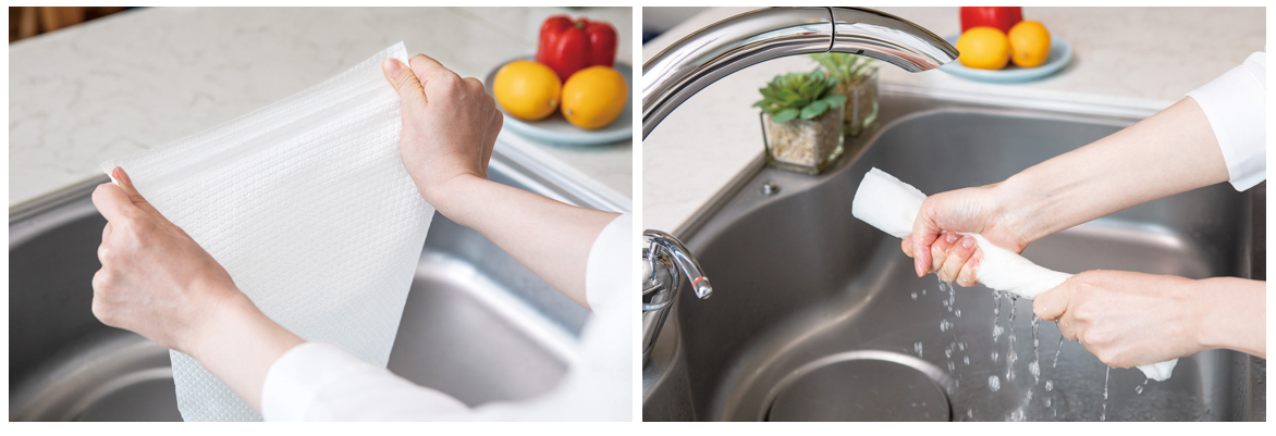 例えば食器を拭き、水洗いしてさらにテーブルを拭き、もう一度水洗いして最後はキッチン周りのお掃除など、1回で使い捨てにするのではなくくり返し使うことができます。