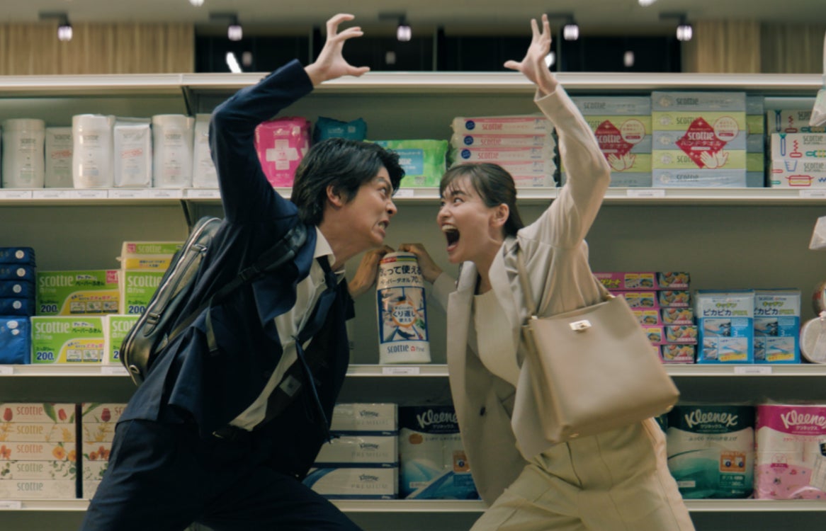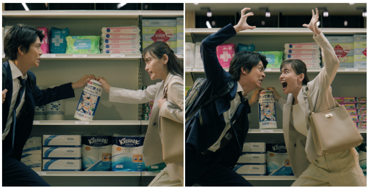 夜遅くのスーパーマーケットの売り場で、仕事終わりにお店3軒まわって見つけた女性と、5軒まわってやっと見つけた男性が「スコッティ ファイン 洗って使えるペーパータオル」の最後の1個をめぐっての争奪を繰り広げています。 通常のキッチンタオルと比較して、破れにくいので、キッチンでの野菜の水切りやシンク掃除のみならず、床掃除や靴磨きなど様々な用途で使用できるから、お互い一歩も譲りません。そんな二人の争奪戦の最後は・・・・。
